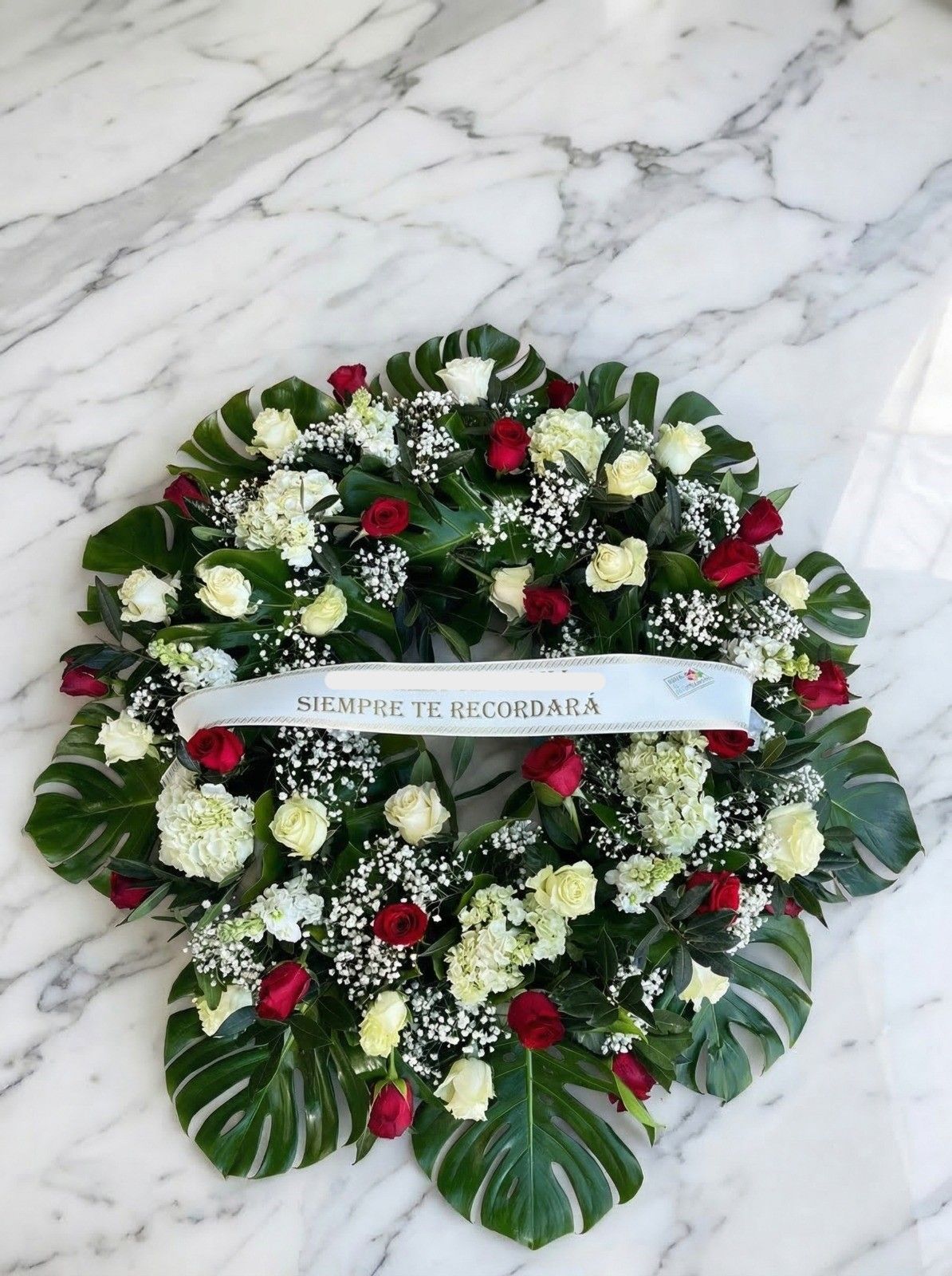 La Corona de ROSAS es un arreglo floral diseñado para expresar condolencias con elegancia y sensibilidad. Su composición combina rosas rojas y blancas o de color a elegir con flor de acompañamiento y relleno, símbolo de amor y respeto-