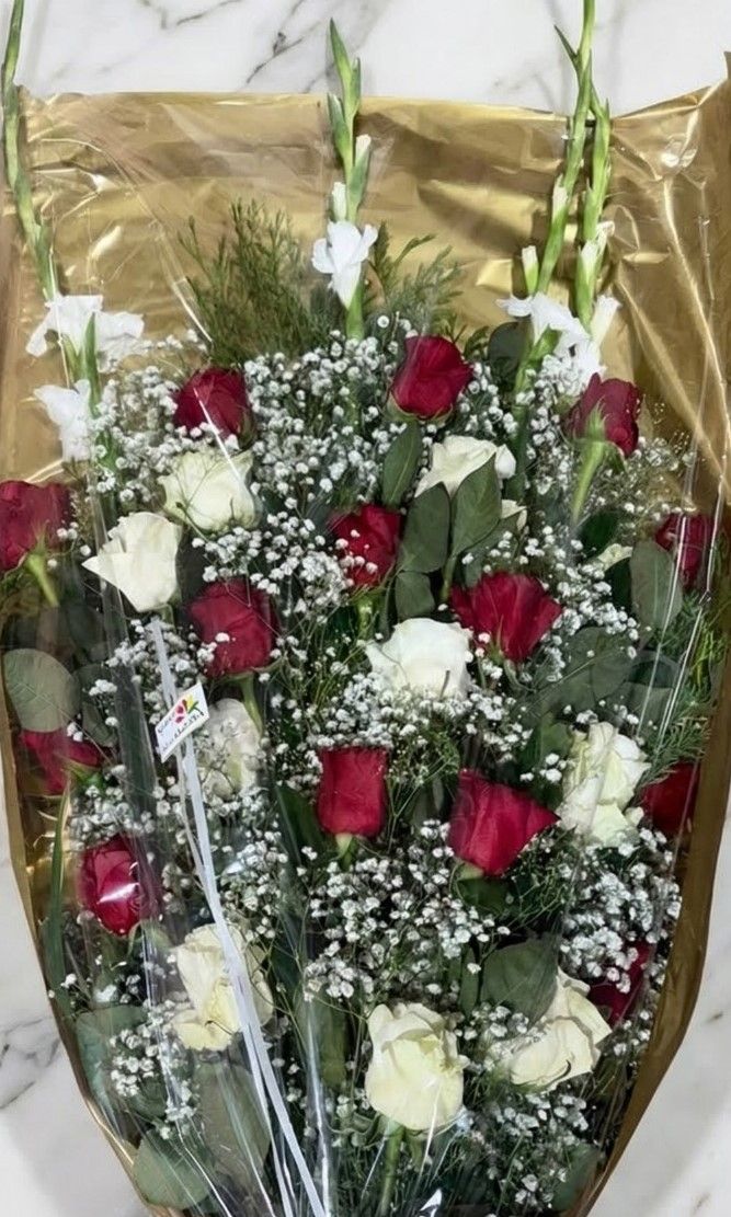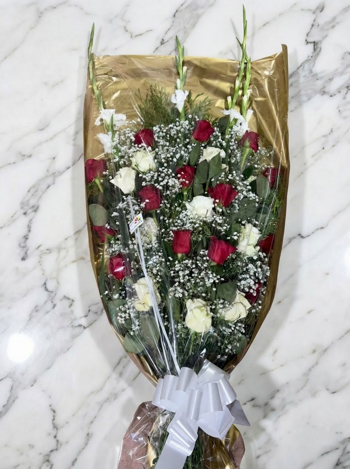 El ramo está compuesto por rosas rojas y blancas frescas cuidadosamente seleccionadas, acompañadas de delicados verdes y pequeñas flores blancas de paniculata que aportan equilibrio y solemnidad al conjunto. Su presentación envuelta en papel elegante con lazo funerario lo convierte en un detalle respetuoso y lleno de sensibilidad.
