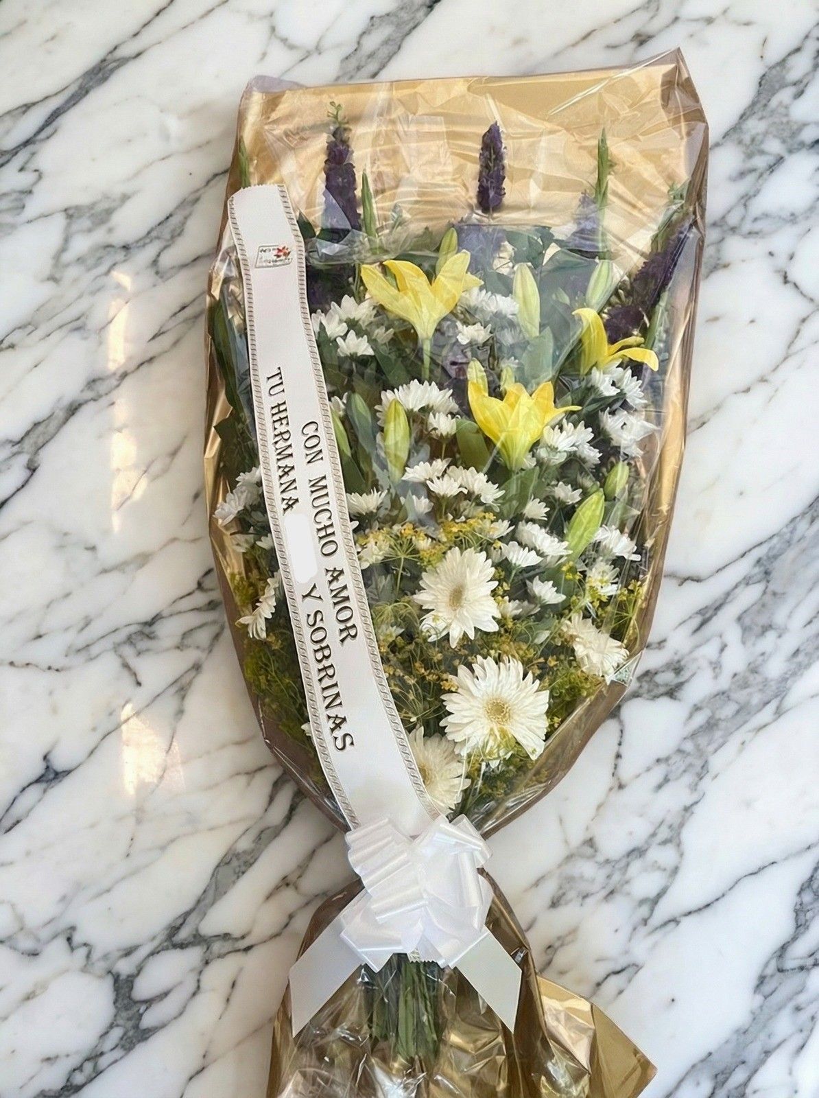 Elegante ramo funerario compuesto por flores variadas frescas como margaritas, lilium o gerberas, acompañada de clavel y gladiolos, símbolo de paz, respeto y recuerdo. Presentado con envoltura decorativa y cinta de condolencias, es una forma delicada y solemne de expresar pésame y acompañar a la familia en momentos difíciles.
