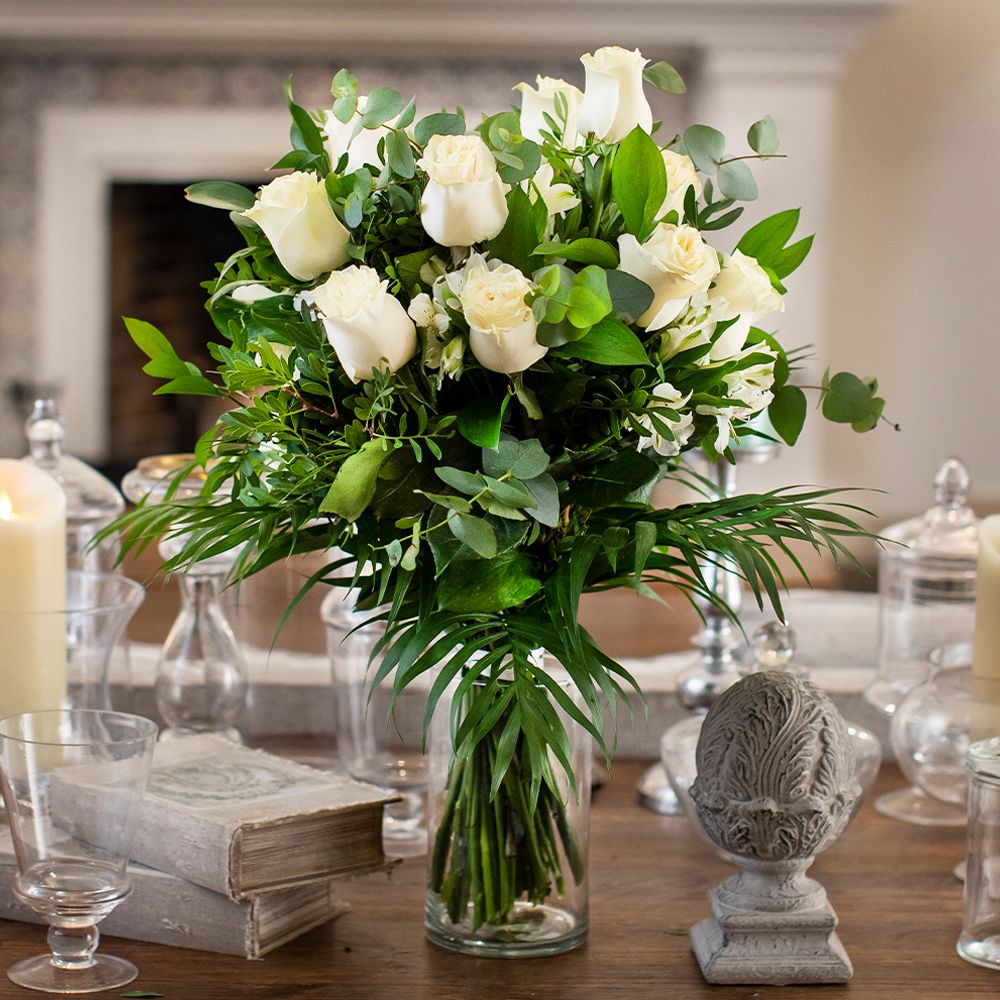 Ramo rosas blancas, compuesto de 12 tallos de rosas blancas, con verdes naturales de diferentes tipo y relleno alstromelias blancas o paniculata según disponibilidad, envuelto en papel decorativo y lazo, podemos hacer el ramos en diferentes tamaños, según los tallos de rosas seleccionados.